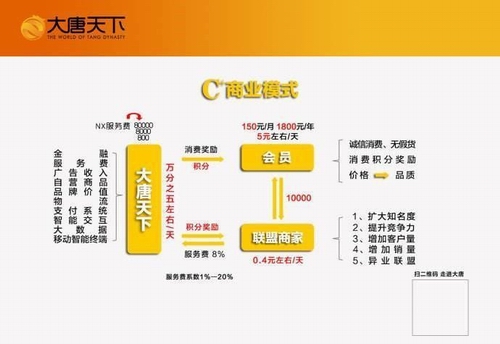 大唐天下的模式是这样的,消费者注册会员消费后花的钱能返还,或者直接充值买积分兑换跟多现金的消费模式,并宣称可以赚到一笔非常可观的利润(俗称发财)。在网上搜索了关于这家公司的相关消息,原来于2016年,这家公司在湖南省已经被当地媒体曝光:涉嫌传销,属于新型的金融骗局,当地相关部门已经介入调查的了。