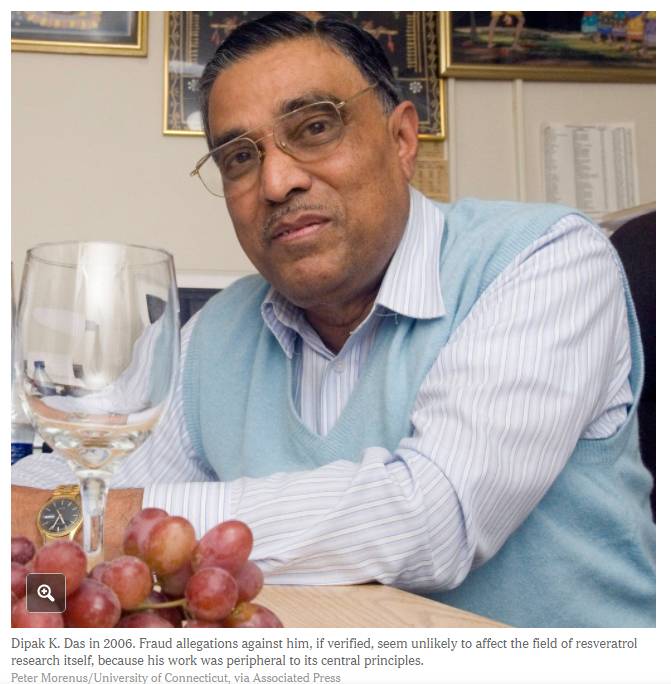 不过他最终却落了个身败名裂。2012年康州大学决定解雇Das,原因是数据造假。大学用了几年时间对Das的研究进行调查,最终确认Das有大量数据造假的行为存在。其中造假非常明显的就有145篇论文,其中也包括很多白藜芦醇的研究。这是本世纪美国科研打架最著名的案例之一。这个爆炸性新闻出现之后,诸多科研期刊对Das的相关论文进行了撤销处理。