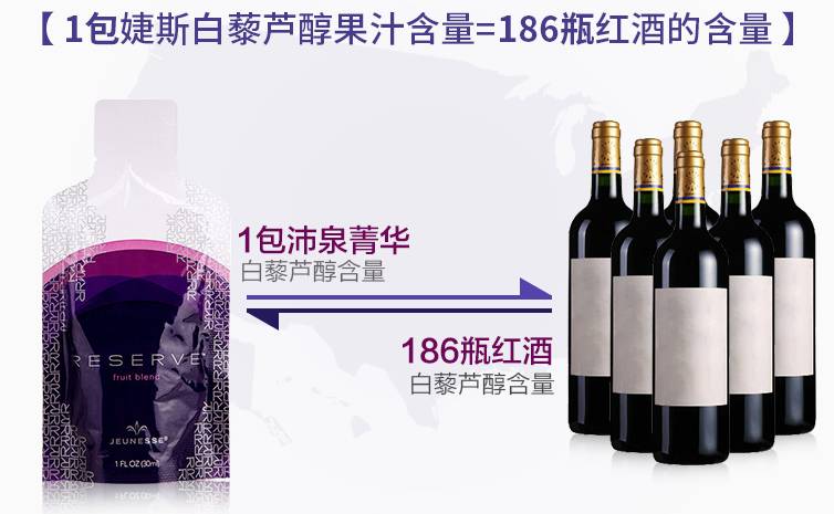如果将那些实验中老鼠的摄入量换算成人的,意味着一个成年人每天需要摄入约1500毫克的,才可能实现同样的效果。而一瓶葡萄酒中的白藜芦醇含量约为5毫克,需要一天喝差不多300瓶。同样根据婕斯自己的声明,每30毫升装里面含白藜芦醇186毫克,也意味着需要坚持每天喝8袋才可以有点效果。