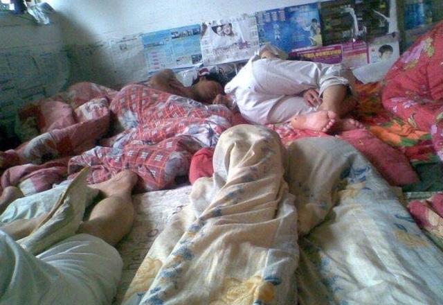 级别高点的还有床睡,我那时候都是谁地铺。夏天热的要死,冬天挤的翻身都翻不了,十几个男人睡一起,左边一摸是个飞机场,右边一摸是个带把的。