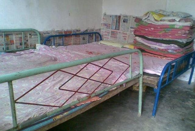 被子都叠的很整齐,手法都一样,全部码在一起堆在墙角再用床单盖着