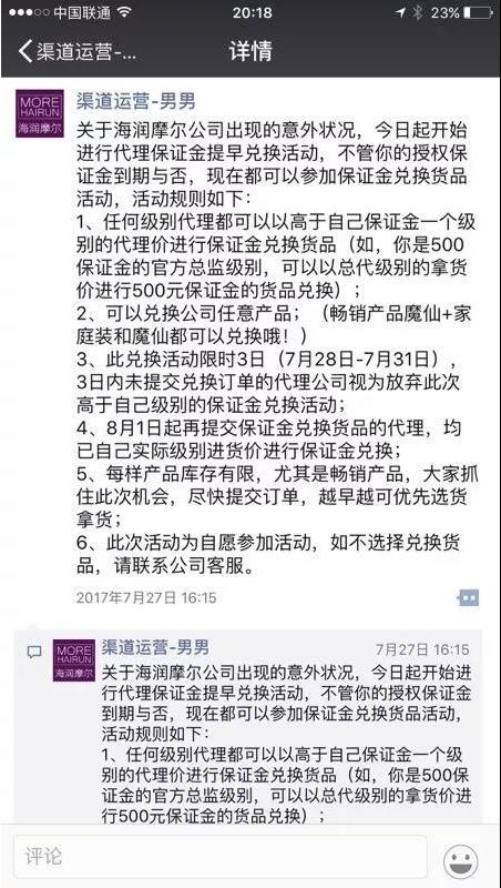 在2017年6月份,美商社曾报道了海润摩尔微商代理在广州拉横幅维权的事件。代理称海润摩尔系诈骗公司,侵吞代理几百万押金不退。当时美商社也就此事联系了海润摩尔公司,公司方面称“部分代理商造谣,已起诉相关代理商。”详情可以看《海润摩尔微商代理维权:指责公司诈骗,侵吞几百万押金?》