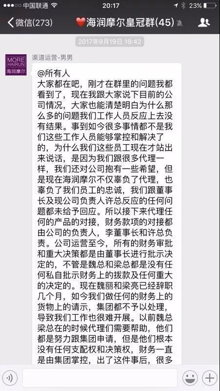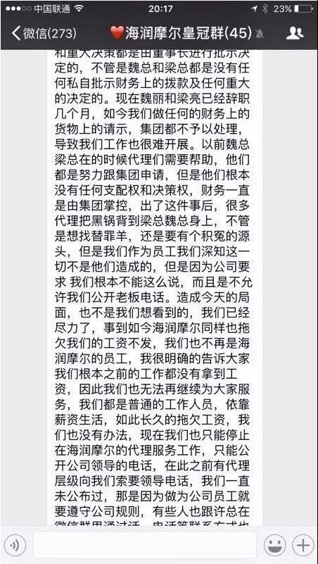 9月19日,“男男”在代理群中称因长久拖欠工资,客服集体辞职。同时还表示“公司运营至今,所有的财务审批和重大决策都是由董事长进行批示决定的,不管是魏总还是梁总都是没有任何私自批示财务商的拨款及任何重大决定的。”“现在魏丽和梁亮已经辞职几个月,出事之后很多代理把黑锅背到两人身上,作为员工我们深知这一切不是他们造成的。”最后表示因问题实在无法解决,直接公布了“李董事长”和“许总”电话,让代理自行找两人处理,客服人员自此与海润摩尔没有任何关系。