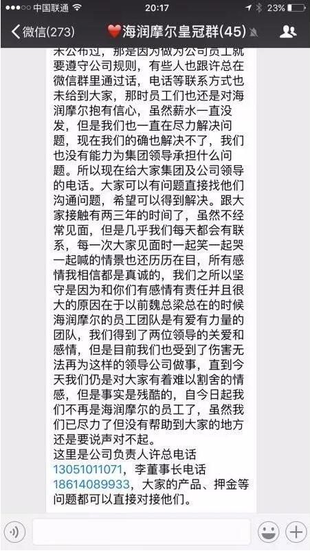 爆料者称“所有代理下单和保证金换货一直都是直接发给客服的,代理金也是直接打到魏丽和梁亮两人的个人账户,什么李董事长许总听都没听说过。现在客服不干了,魏丽和梁亮两人也失去联系,给的电话也打不通。现在我还有40万货款在海润摩尔,下单提货客服说没货。我们这个团队有两三百万没发货的货款和保证金,其他还有几个团队我不清楚,但是估计也欠的不少。”