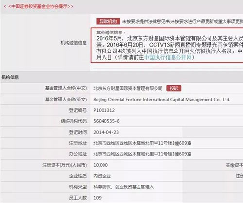 从协会的备案登记信息来看,北京东方财星国际资本管理有限公司成立于2010年8月12日,备案于2014年4月23日,属于私募股权、创业投资基金管理人。注册资本金1亿元人民币,实缴比例为30%。