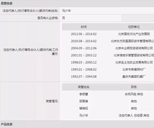 马少华任东方财星法定代表人、总经理,但目前并不具备基金从业资格,另一位高管李哲慧也没有从业资格。旗下备案私募产品“北京国宏金桥财星创业投资中心”。