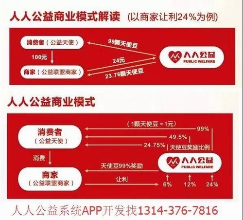 上图是人人公益的运行模式,是让加盟商家将顾客消费额的固定比例,如24%,12%或者6%,交给平台形成资金池。以消费者消费100元,商家交给平台24元为例,平台资金池将分期返还给消费者99元,另一元拿去做公益,而商家让利给平台的24元,也将被分期的返给商家共23.76元。对于商家和消费者来说,基本没有任何损失,相反还能额外获利。真有这样的好事吗?