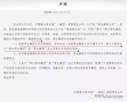 对此,贵州茅台集团专门为此发表过声明:未经茅台集团公司书面授权,任何企业(包括茅台集团公司下属子公司)或个人都无权以“贵州茅台集团”或“茅台集团”名义开展任何性质的活动。