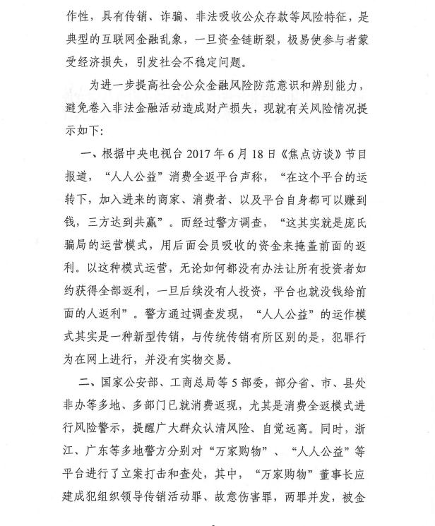 一、根据中央电视台2017年6月18日《焦点访谈》节目 报道,“人人公益”消费全返乎台声称,“在这个平台的运 转下,加入进来的商家、消费者、以及平台自身都可以赚到 钱,三方达到共赢”。而经过警方调查,“这其实就是庞氏 骗局的运营模式,用后面会员吸收的资金来掩盖前面的返利,以这种模式运营,无论如何都没有办法让所有投资者如约获得全部返利,一旦后续没有人投资,平台也就没钱给前 面的人返利”。警方通过调查发现,“人人公益”的运作模式其实是一种新型传销,与传统传销有所区别的是,犯罪行为在网上进行,并没有实物交易。