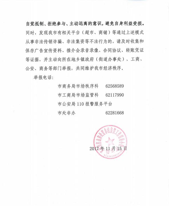 同时,发现我市有相关平台(超市、商铺)等通过上述模式从事非法传销诈骗、非法集资等不法行为的,请及时收集和保存广告宣传资料、推介会录音录像、合同协议、转账凭证 等证据,并主动向所在地乡镇政府(街道办事处)、工商、 公安、商务等部门举报,共同维护我市经济秩序。