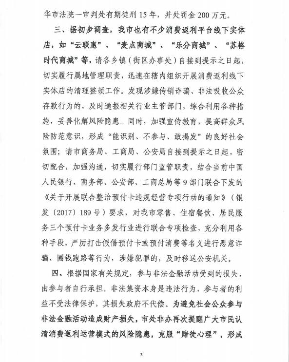 三、据初步调查,我市也有不少消费返利平台线下实体店,如“云联惠”、“麦点商城”、“乐分商城”、“苏格时代商城”等,请各乡镇(街区办事处)自接到提示之日起, 切实履行属地管理职责,迅速在辖内组织开展消费返利线下实体店的清理整顿工作。发现涉嫌传销诈骗、非法吸收公众存款行为的,及时通报相关行业主管部门,综合利用各种措施,妥善化解风险隐患。同时,加强宣传教育,提高群众风险防范意识,形成“能识别、不参与、敢揭发”的良好杜会氛围;请市商务局、工商局、公安局自接到提示之曰起,密切配合,加强沟通,切实履行部门监管职责,结合当前中国人民银行,商务部、公安部、工商总局等9部门联合下发的《关于开展联合整治预付卡违规经营专项行动的通知》(银发(2〇m 189号)要求,对我市零售、住宿餐饮、居民服务三个预付卡业务多发行业进行联合专项检査,充分利用各种手段,严厉打击假借预付卡或预付消费等名义进行恶意诈骗、圈钱跑路等行为,涉嫌犯罪的,及时移送公安机关。