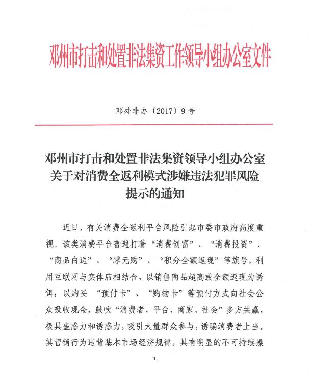 近曰,有关消费全返利平台风险引起市委市政府高度重视。该类消费平台普遍打着“消费创富”、“消费投资”、 “商品白送”、“零元购”、“积分全额返现”等旗号,利用互联网与实体店相结合,以销售商品超髙或全额返现为诱饵,以购买“预付卡”、“购物卡”等预付方式向社会公众吸收现金,鼓吹“消费者、平台、商家、社会”多方共赢, 极具蛊惑力和诱惑力,吸引大量群众参与,诱骗消费者上当。其营销行为违背基本市场经济规律,具有明显的不可持续操作性,具有传销、诈骗、非法吸收公众存款等风险特征,是典型的互联网金融乱象,一旦资金链断裂,极易使参与者蒙受经济损失,引发社会不稳定问题。