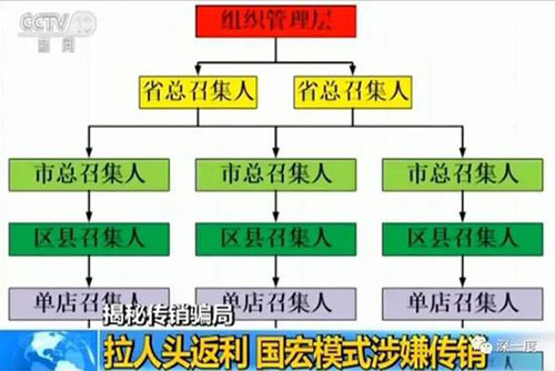 今年6月的央视报道中,黔东南州公安机关专案组一名负责人表示:国宏系主要采取的是拉人头,从下线收取费用来返利的模式,其返利结构类似金字塔,“通过侦查发现的它的这种传销的这种层级,还有它的这种计酬模式,都符合当前传销犯罪的一些典型的特征。”