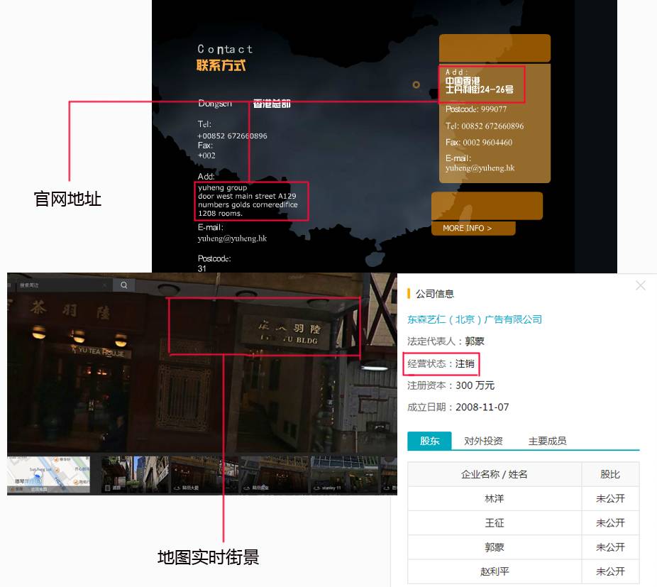 从官方展示的资料来看,金果乐园背景实力雄厚,但是事实并非如此。通过对比发现,裕恒集团所展示的资料图实则是长江集团中心及三盛地产项目发布会的照片。而裕恒集团官网上的总部地址及北京办事处地址并没有一家名为裕恒集团的公司,实际上在这两个地址上分别是香港著名茶餐厅陆羽茶室和一家名为东森艺仁的广告公司。值得注意的是,裕恒集团官网上展示的大部分业务都是由这家广告公司承办的,但事实上,这家广告公司已处于注销状态。