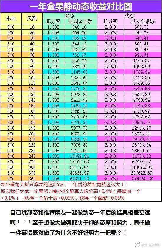 由此,玩家一年后即可获利近5万元。这期间玩家需要付出的,仅仅是每天抽几分钟进行“施肥”。正如游戏宣讲的“边玩游戏边挣钱,娱乐赚钱两不误”。有人肯定会问,那如果一次性投入3.3万元,种100棵金果树,那么一年后收入岂不是达到500万?这一点金果乐园表示:任何人起步只能投入330元,一个手机号只能注册一个会员,如果想要更多的利益,就需要通过做动态来获取。