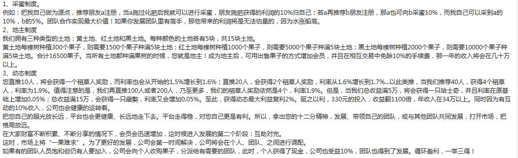 那么游戏又是如何吸引新会员的呢?在发展新会员时,很多上家都给出了这样一些理由:“330元又不多,以前玩股票一个点都不止赔这些”“330元就当吃顿饭、买件衣服了”。正是由于这类游戏平台门槛低,大多数人都抱着试一试不吃亏的态度注册了会员。金果乐园官方信息介绍,游戏正式开放后仅2月到4月期间,就发展了团队3800人,发展规模遍布全国9大省市。游戏还宣称:“预计将会拥有300万会员,公司也将继续开发新的项目,会将所有老会员平移到新项目里。”其宣称的这种前景,正是这一类理财游戏的通用模式。截至笔者发稿前,有疑似金果乐园工作人员发布了这样一则消息:金果乐园将升级为3.0系统,在种植果树的基础上增加了养鸡场、鱼塘等,游戏名称也将变为金果农场。