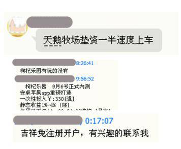 事实上,金果乐园在理财游戏江湖上并算不上“大咖”,早在2016年,理财游戏就已经掀起过一阵高潮。到2017年上半年,市面上还在频繁推出这类“330”游戏。不管是种树还是种花,喂鸡还是养天鹅,其本质都是“复利、拆分”。这些游戏大多都是投资330元,获取原始启动筹码,然后将筹码以动植物的方式体现在游戏里,每天按照一定的利率进行拆分,再打着限量的旗号,对接线上商城或线下实体,进行泡沫消耗和引流。当泡沫难以消耗时,再推出新的项目进行平移。