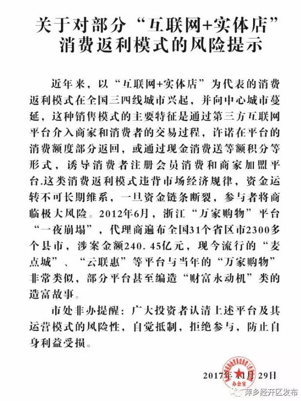 关于对部分“互联网+实体店”消费返利模式的风险提示