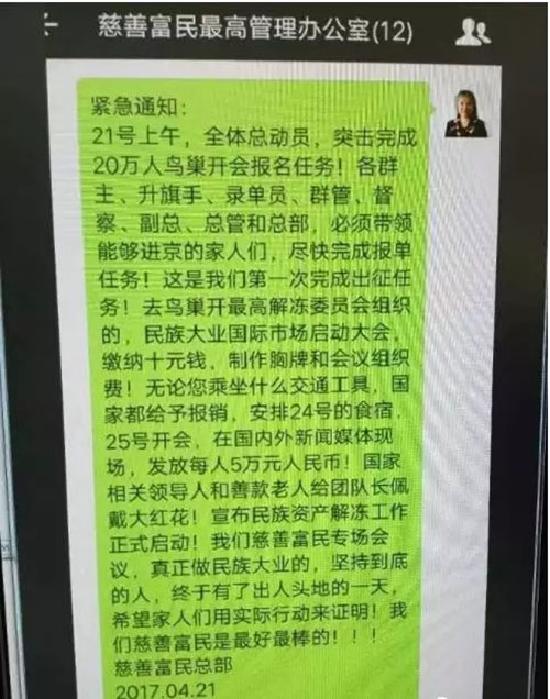 “去鸟巢参加‘最高解冻委员会’组织的民族大业国际市场启动大会,只需缴纳10元的胸牌制作费!”“无论您乘坐什么交通工具,国家都给予报销,安排24号食宿,25号开会,在国内外新闻媒体现场,发放每人5万元人民币!”今年4月20日左右,天津大港人陈某英在其组织的微信群中广泛散布这一“紧急通知”。据介绍,她的这一消息来自在广西凌云经营家具生意的杨某兴,自称是“民族资产解冻委员会的工作人员”。