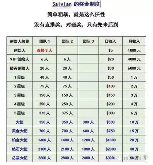 “赛比安”与“WV梦幻之旅”一样实行“双轨制”,鼓励会员分左右两区发展下线,只有两区各达到一定的人数,才能达到相应的等级。按照发展人数,设立从低到高的金字塔等级,依次为创始人、V IP创始人、精英创始人、1到5星级、大使级、黄金大使、铂金大使、钻石大使、总裁大使。“赛比安”和“WV梦幻之旅”一样都是通过“拉人头”的方式发展“团队”,发展下线时收取会员的月费。入会“赛比安”虽然不用交入会费,但是每个月要交125美元即人民币850元的月费。如果要免交月费,则需要发展下线———“只要直推3人,即可抵消入会费用,而且每天还可到账5美元”。