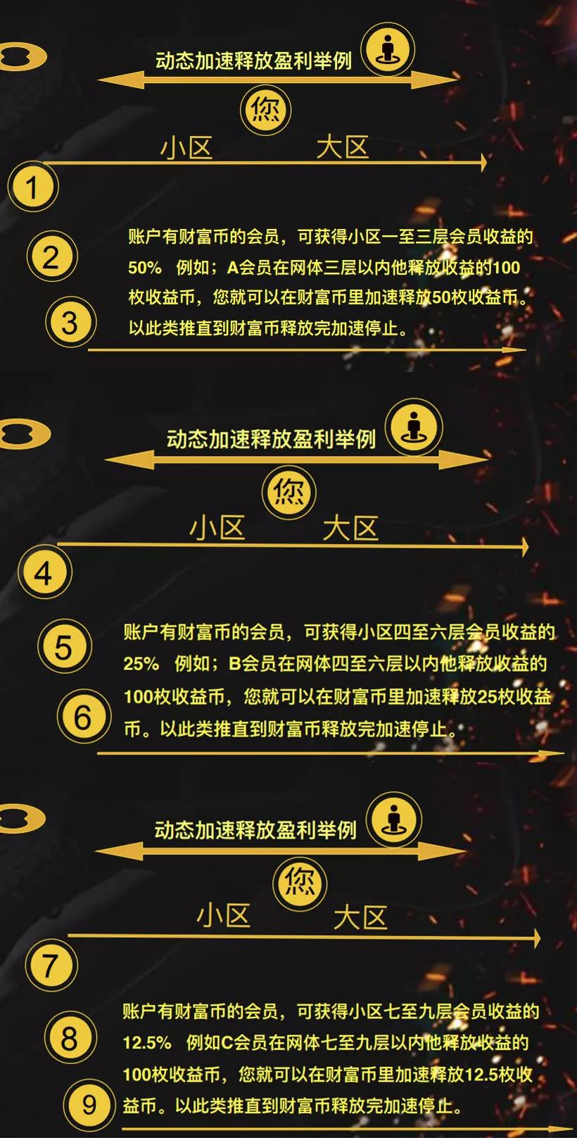 第四种为动态加速释放盈利。动态加速释放盈利是针对账户有财富币的会员,除推荐奖外还可以根据不同的代数会员释放收益币的百分比加速释放收益币,知道财富币用完停止加速为止。