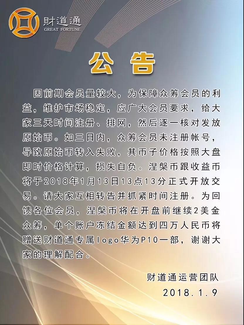 与此同时,财道通进入最后的内排注册时期,2018年1月9日发布公告如下: