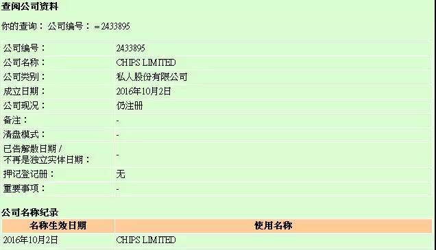 而在“财道通”搞得沸沸扬扬的同事,王者军团运营的另一款虚拟货币交易项目“CPS”也随之面世。CHIPS是一个清算应用平台,而speedhelp是CHIPS中最有吸引力的一个应用。该运作理念诞生于2015年3月,创始人名为黄国榛,公司名为CHIPS LIMITED,注册于香港九龙半岛,注册资本500万港元,实缴资金不详,是一家股份制有限公司,该公司主要执行以下业务: