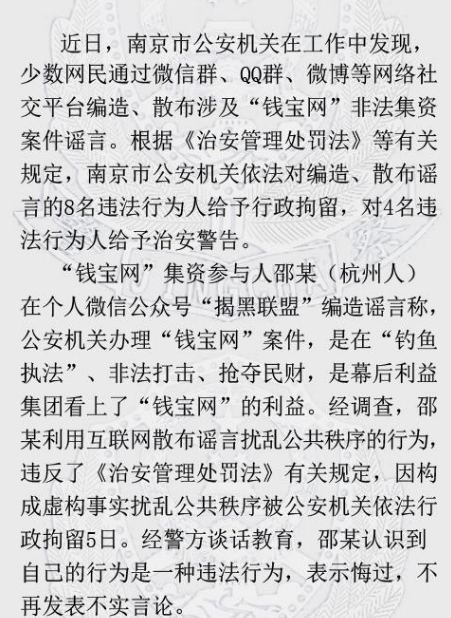 南京警方:钱宝网非法集资案件8名造谣者被拘
