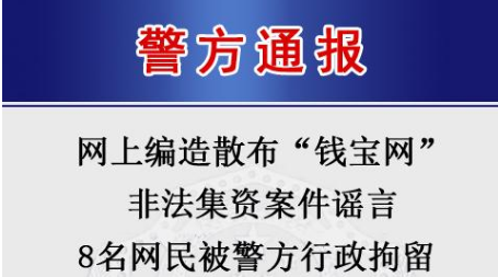 南京市公安局称,近日,南京市公安机关在工作中发现,少数网民通过微信群、QQ群、微博等网络社交平台编造、散布涉及“钱宝网”非法集资案件谣言。根据《治安管理处罚法》等有关规定,南京市公安机关依法对编造、散布谣言的8名违法行为人给予行政拘留,对4名违法行为人给予治安警告。