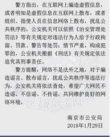 1月29日,江苏省南京市公安局官方微博“平安南京”发布《网上编造散布“钱宝网”非法集资案件谣言 8名网民被警方行政拘留》的警方通报。