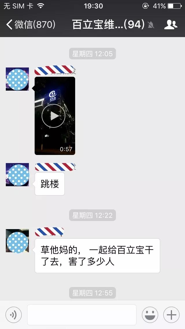 近一个月,百科君从百立宝维权群里的视频看到,有部分损失惨重的会员先后去到百立宝公司讨说法。截至发稿前,群内相关知情人士还发了一段视频并透露,一名怀有四个月身孕的孕妇为讨说法,站在百立宝公司楼上哭喊着要跳楼,结果未知。