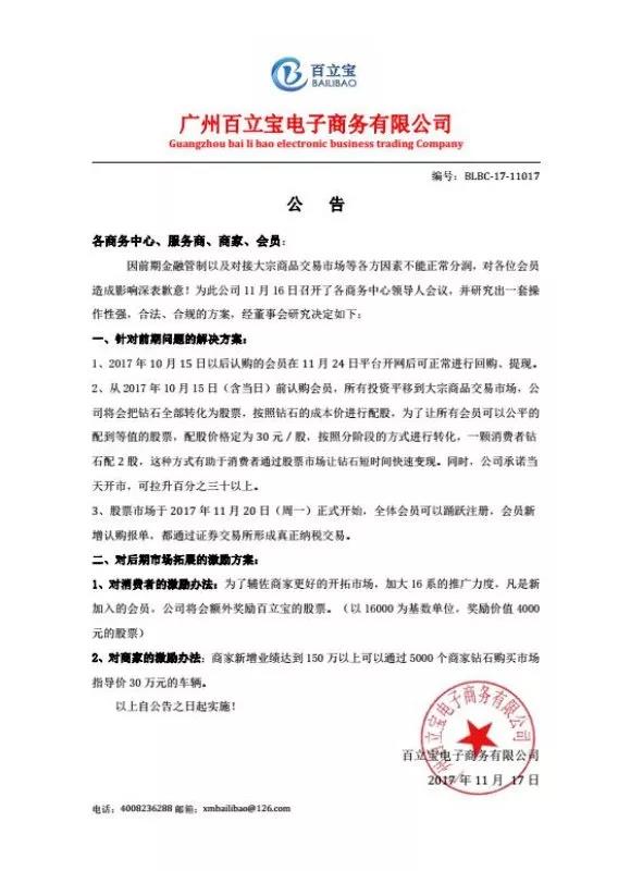 相关文件显示,在10月16号之前“钻石”分配到账的会员,所有投资都会平移到该“交易所”,百立宝将在23日前把所有老会员的钻石全部转化为“股票”,即《百立宝1号(股票代码:901301)、2号(股票代码:901302)、3号(股票代码:901303)》,并按照“钻石”的成本价进行配股,配股价格定为30元/股,按照分阶段的方式进行转化,一颗消费“钻石”配2股,“股票”可在交易市场自由交易,百立宝承诺当天开市,会拉升百分之三十以上。“钻石”分配到账在10月16日以后的会员,还有商家、服务商、商务中心不进行配股,正常分润、回购和提现。
