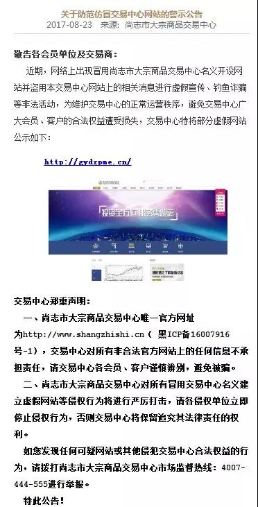 关于随遇而安口中的“交易所”,百科君发现,在百度首页有两个“尚志市大宗商品交易中心”,且网站内容完全不一样。其中一个网站的公告显示:近期,网络上出现冒用尚志市大宗商品交易中心名义开设网站并盗用本交易中心网站上的相关消息进行虚假宣传、钓鱼诈骗等非法活动......交易中心郑重声明:尚志市大宗商品交易中心唯一官方网址为http://www.shangzhishi.cn( 黑ICP16007916号-1)。