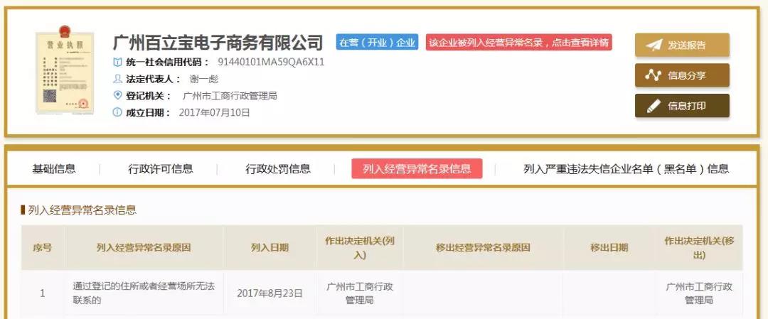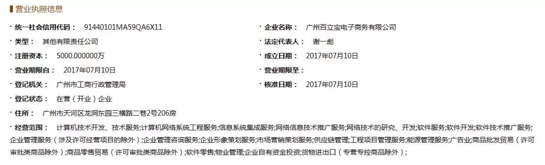 据官网显示,百立宝成立于2017年,总部位于广州,注册资金为5000万人民币(是否实缴情况不详)。国家企业信用信息公示系统显示,广州百立宝电子商务有限公司属法人股东注册。第一大股东朱杰麟,是广州百立宝电子商务有限公司的投资商之一,持股60%,认缴出资额3000万;第二大股东谢一彪,是广州百立宝电子商务有限公司的法人代表,也是法人股东,持股40%,认缴出资额2000万;第三大股东杨雅维则是广州百立宝电子商务有限公司监事。2017年8月,百立宝曾因登记住所无法联系,被广州市工商行政管理局列入经营异常名录。