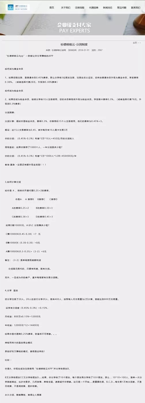 公司官网称,杉德哆啦云以聚合支付为核心产品,无卡多渠道支付,高佣金分润,手机秒变POS机,费率低。如果将杉德哆啦云APP分享给10个朋友注册,每个朋友再分享给10个朋友注册,无限裂变,无限代永久分润,躺着赚钱,财富将不可想象。