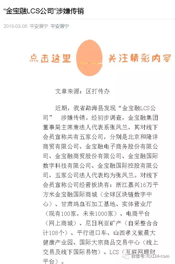 近期,云南省勐海县发现“金宝融LCS公司”涉嫌传销。经初步调查,金宝融集团董事局主席兼法人代表系张凤兰,其对线下会员宣称共有五家公司,分别是北京和隆详商贸有限公司、金宝融电子商务股份有限公司、金宝融商贸股份有限公司、金宝融国际数字科技有限公司、金宝融国际控股有限公司,五家公司法人代表均为张凤兰。对线下会员宣称公司经营板块有:浙江嘉兴16万平方米金宝融国际商城(全球区块链数字中心)、甘肃鸡血石加工基地、实体营业厅(现有100家,未来1000家)、电商平台(网上商城)、尼日利亚矿产(自采整合合计108个)、平行进口车、山西孝义紫晨大健康产业园、国际大宗商品交易中心(线上交易及线下国际易物)、LCS(互联网理财平台)。