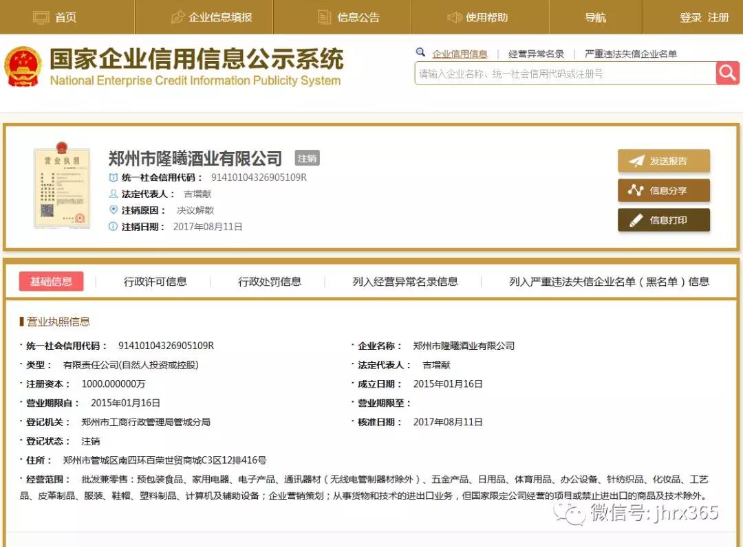记者登录国家企业信用信息公示系统核实,隆曦旗下的杰优电子、隆阁易购、友君科技三家公司子虚乌有,成立于2015年1月16日的郑州市隆曦酒业有限公司已2017年8月17日注销,法人代表为吉献增。隆曦实业有限公司、河南隆乐曦实业有限公司两家公司法人为白国政,于2017年9月份和8月份在山东青岛和河南郑州注册登记,目前,该企业被列入经营异常名录。
