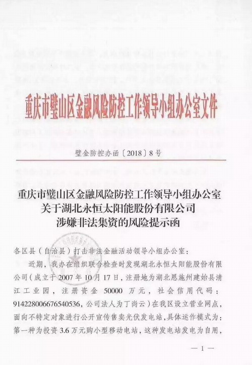 2018年4月4日,重庆市璧山区金融风险防控工作领导小组办公室发布了红头文件,关于湖北永恒太阳能股份有限公司涉嫌非法集资的风险提示函。