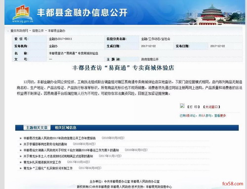 12月初,丰都金融办会同公安经侦、工商执法组成联合调查组对辖区易商通专卖商城体验店实地查访。3家门店经营模式相同,店内陈列商品无制造商名称、生产地址、产品合格证、产品执行标准等标识,所有商品无标价也不现场销售。消费者须先通过网站注册再网上选购,产品质量和消费者的合法权益得不到保证。因易商通平台后端控制人行为不可控,可能存在非法集资风险。