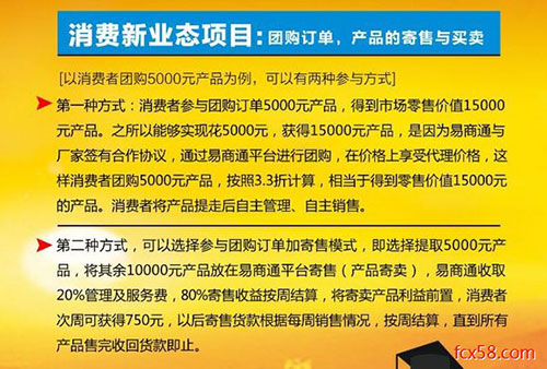 易商通打着“军创”旗号,以所谓的“消费新业态+本地化消费+即将引爆市场的普惠电商消费养老项目”为口号,打着“消费资本论”的理论幌子,宣称投5000能赚8000,并且存在一人投资高达数十万的普遍情况,存在极高的金融风险,涉嫌传销和非法集资。他们宣称的模式如下图: