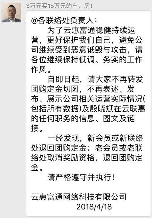 一方面举办周年庆,一方面在媒体曝光后开始封锁信息。云惠富通车房俱乐部另外一位核心人物徐水平则发布内部通知,要求各地机构和工作人员不得再发布各种宣传资料,包括新入的会员转账截图、公司各种运营图片、各种运营数据,也要求不得再将殷晓斌在云联惠总部的任职对外宣传。如果有会员或者办事机构违反这条紧急规定,将被该公司剔除出局,以此封锁信息达到掩盖其所涉嫌的不法行为。因为事发突然,不少接到要求的会员和办事机构一脸困惑,甚至该条规定还与云惠富通车房俱乐部之前要求的广泛宣传规定相冲突。