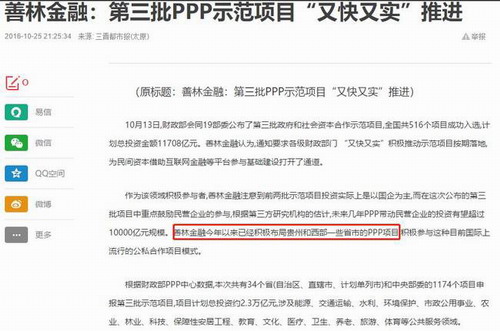 从2016年起,善林金融及周伯云多次对外宣称,投资了贵州等西部地区的PPP项目,但却并未见后续投资后续进展。
