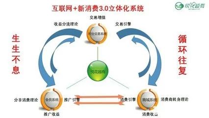 商家通过加入悦花越有开办网店,消费者则通过在网店购买商品,形成一个以悦支付为纽带的悦花越有、商家和消费者三方线上商业链条。在这个链条中,消费者购物的花费及商家留存在平台的导流费用,均会按照每天千分之一比例返还。