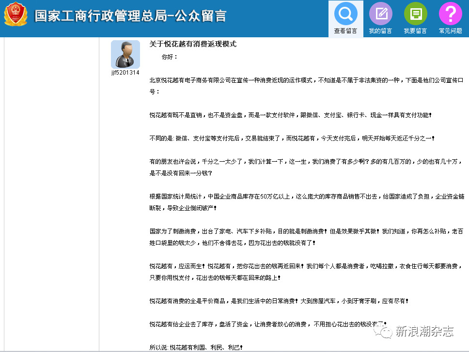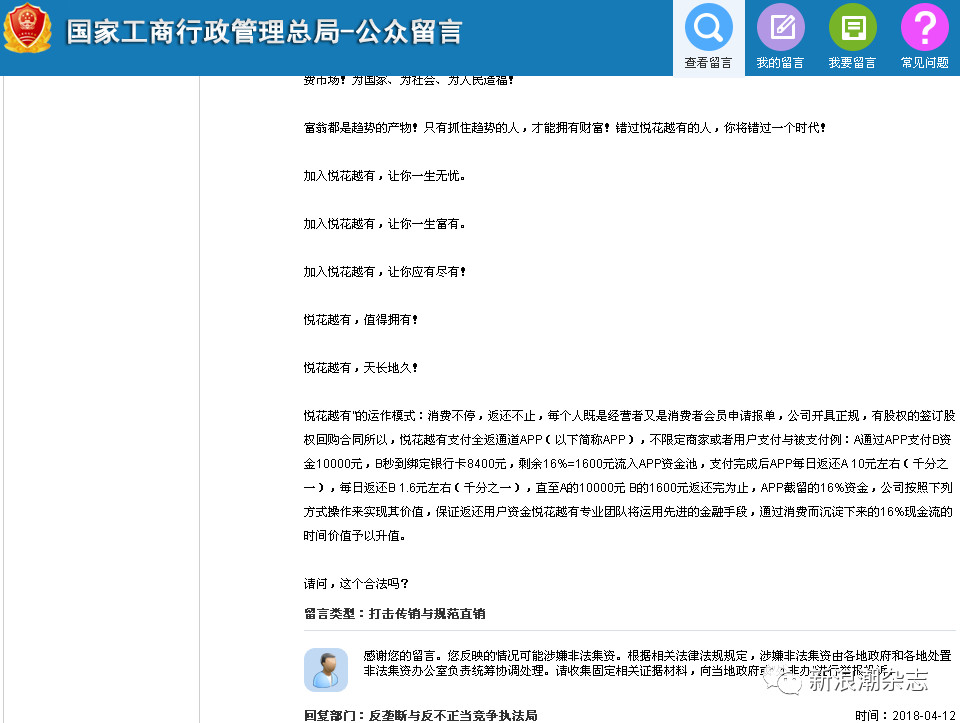 近日,有网友就“悦花越有的消费返现模式”在原工商总局网站留言,询问其返现模式是否合法。4月12日,反垄断与反不正当竞争执法局做出回复,称该网友反映的情况可能涉嫌非法集资:“根据相关法律法规规定,涉嫌非法集资由各地政府和各地处置非法集资办公室负责统筹协调处理。请收集固定相关证据材料,向当地政府或‘处非办’进行举报投诉。”