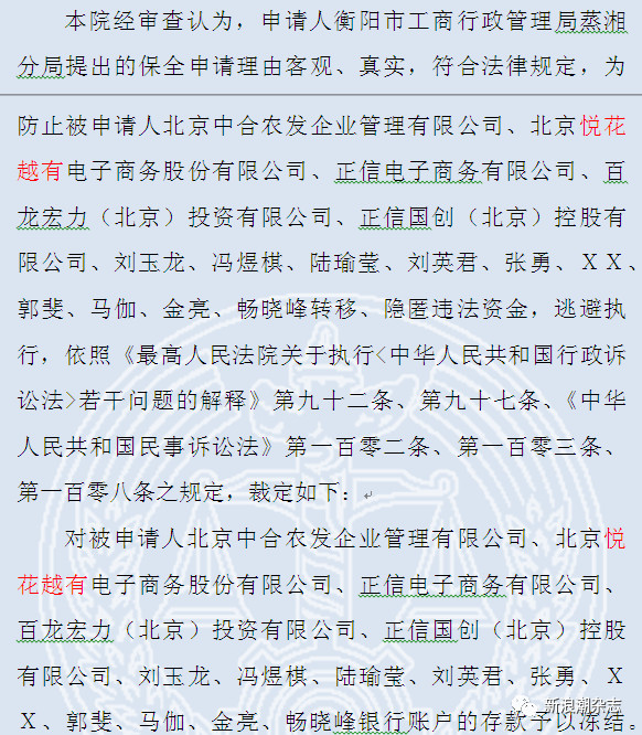 根据被告证据、一份公开裁定书显示,湖南省衡阳市蒸湘区人民法院于2017年3月24日,经衡阳市工商行政管理局蒸湘分局申请,包括本案原告正信电子在内的北京中合农发企业管理有限公司、北京悦花越有电子商务股份有限公司、正信国创(北京)控股有限公司及相关法定代表人(总经理)等银行账户的存款均予以冻结,冻结理由是涉嫌传销。
