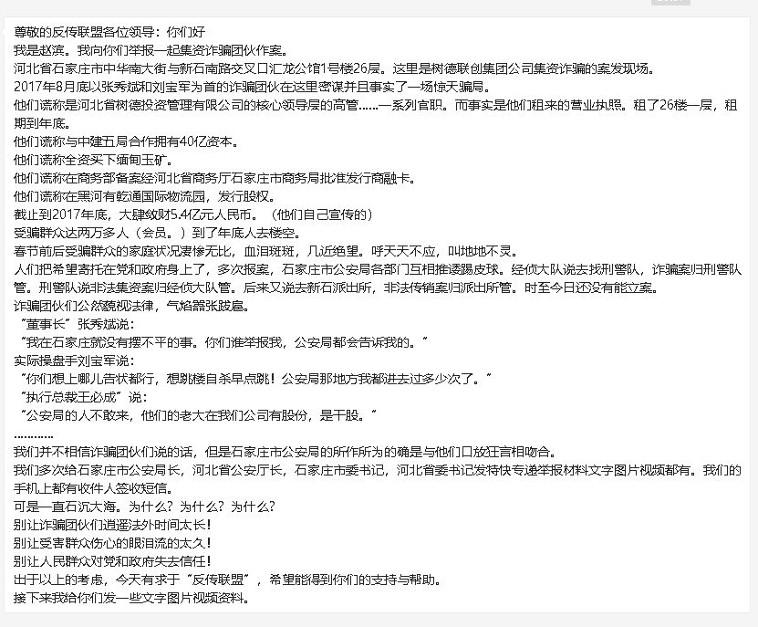 “树德联创”诈骗金额5亿元很嚣张,会员血本无归实名举报无人理