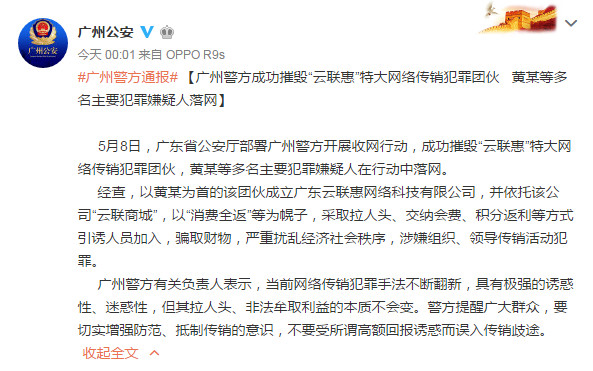 5月9日凌晨00:01,广州公安在其官方微博上公布消息称:5月8日,广东省公安厅部署广州警方开展收网行动,成功摧毁“云联惠”特大网络传销犯罪团伙,黄某等多名主要犯罪嫌疑人在行动中落网。