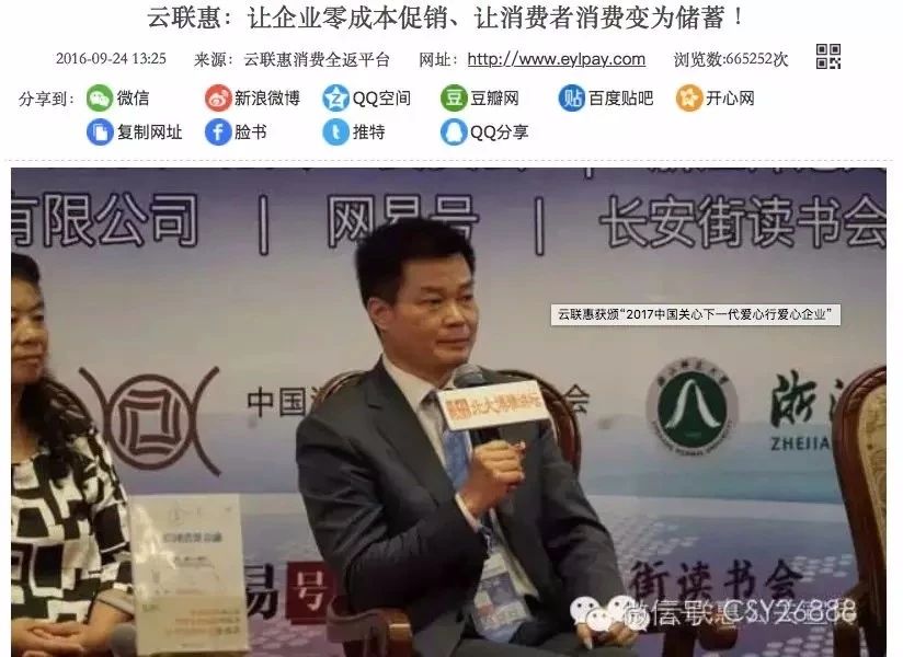 并且,云联惠在其官网还打出了“消费等于赚钱/存钱”的口号。此外,云联惠的官网上,不乏各种“高大上”的宣传:国际论坛、颁奖仪式、慈善、培训、战略合作……
