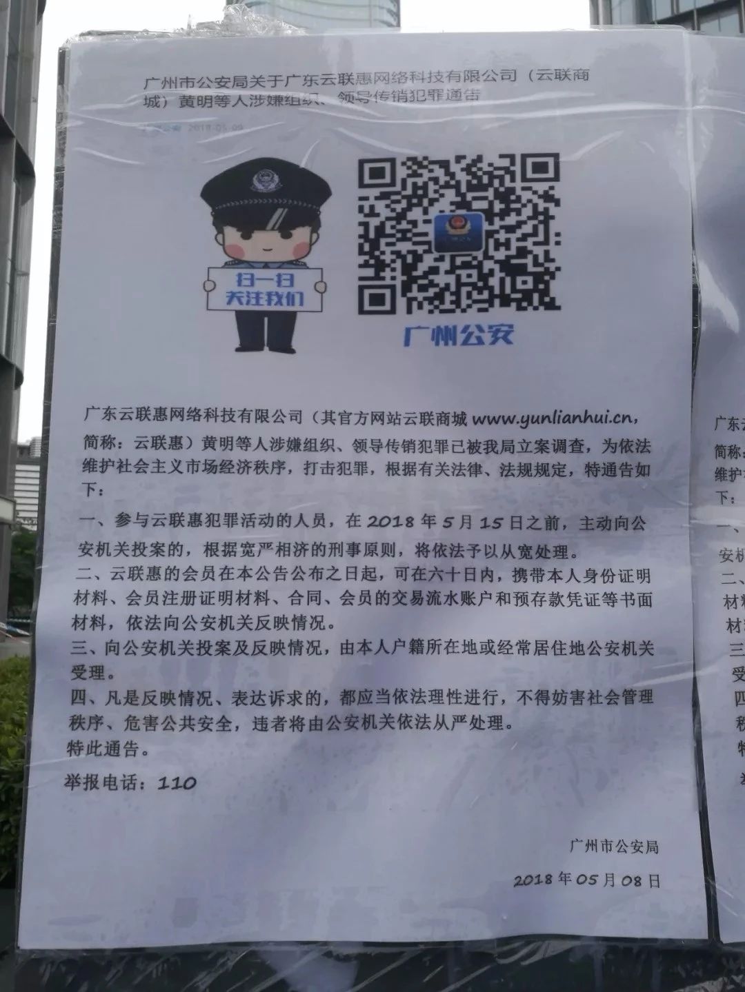 广场外面贴着云联惠相关人员涉嫌组织、领导传销犯罪的通告。
