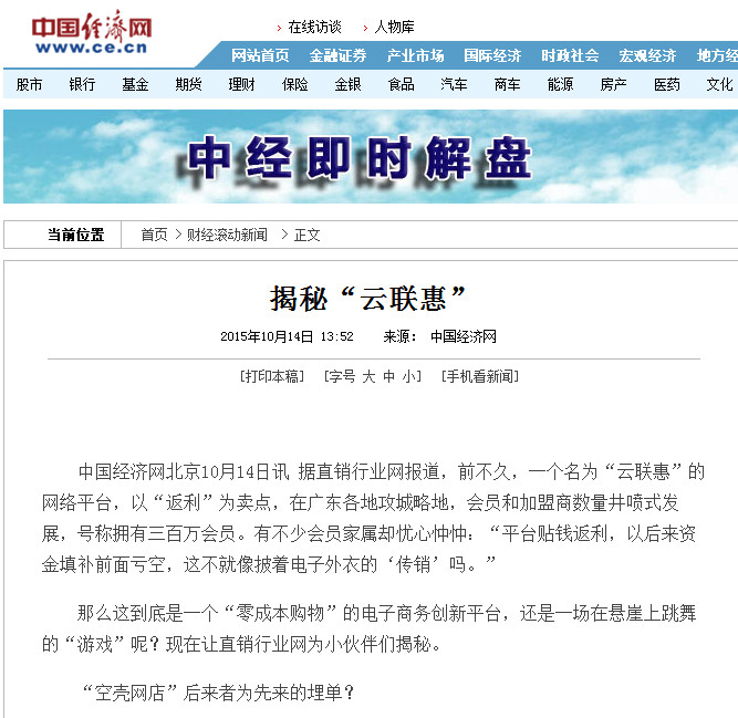 早在2015年10月,就有媒体报道对云联惠提出了质疑。报道称,“云联惠”购物平台交易量甚少,多位加盟商的家属指控这是一家“空壳网店”,主要靠收取联盟商家16%的营业额维持运营,其他收入甚少。